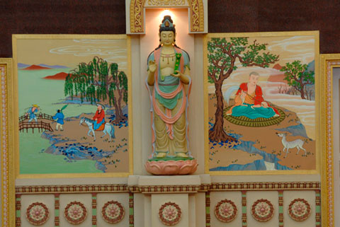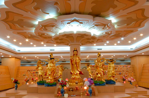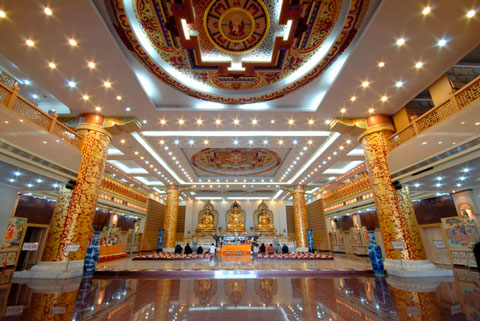 一千二百平方米的佛事大殿金光燦然,層高達(dá)十米,其博大、莊嚴(yán)與恢宏,實為罕見