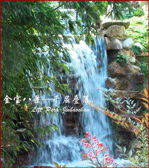 水清洌,石質(zhì)樸,瀑千層,聲轟然,飛珠散落,細霧飄飄。清清水簾高低錯落懸掛,點水雀啾啾飛躍自得其樂。風吹綠枝搖擺,幾簇紅花點綴,造境渾然天成,得大寫意山水畫的神韻,亦有工筆描繪的精巧。