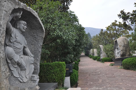 栩栩如生的十八羅漢,沿著步道整齊排列,每尊羅漢高度近2米,全部采用福建青草石整體雕刻而成,石材的造型不同,羅漢的形態(tài)各異,形成了一個(gè)頗具看點(diǎn)的景觀。