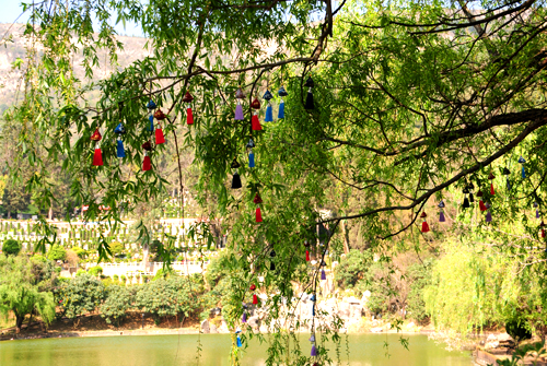 穿過柳綠,或沿池邊漫步,或在椅上小坐,看桃紅柳綠,聽鳥鳴瀑音,融于自然之中,歸入心靜之境,恍然有桃源勝境之感。