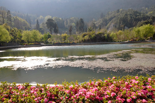 格局如太師椅般舒適,風(fēng)水自不必說,原生植物與綠化植物自然交錯,隨四時變化,呈現(xiàn)出豐富的色彩。在錯落有致的層臺上凝視天池,感由心生,這里是安享清閑的絕佳之地。