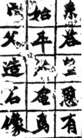 《龍門二十品》是龍門石窟中的二十尊造像的題記拓本,北魏書風的代表作?涤袨榉Q龍門石刻“皆雄峻偉茂,極意發(fā)宕,方筆之極規(guī)也”。而《始平公造像》又是龍門石刻中的代表作。立于太和二十二年(498)。此碑與其它諸碑不同之處是全碑用陽刻法。筆畫折處重頓方勒,鋒芒畢露,顯得雄峻非凡。