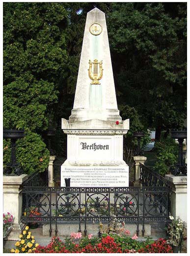 貝多芬的墓碑呈尖錐形,像一把直立的寶劍,正面上部雕刻一個圓環(huán),圓環(huán)中刻有一只蜜蜂,圓環(huán)下刻有一個豎琴,兩者都呈金黃色,下面刻著他的名字。墓碑四周有黑色的鐵欄。
