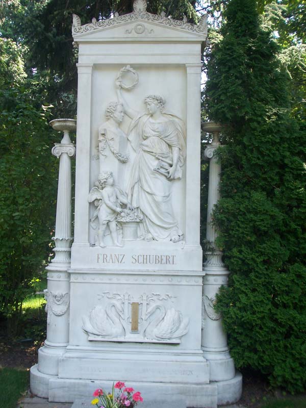 舒伯特的墓碑非常漂亮,刻有舒伯特的雕像,面對一位神采飛揚的美麗女神,一手拿一把豎琴,一手舉著一個花環(huán),微笑面對舒伯特。常恨言語淺,不及情意深。今朝兩相見,脈脈萬重心。