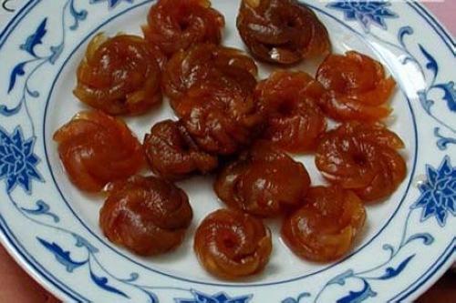 雕梅。采用當?shù)靥赜兄t花大鹽梅精制而成,據(jù)考證已有二百多年的加工歷史。往昔專營雕梅的作坊頗多,較為出名的有羅氏“甫慶昌”、張氏“瑞興號”、徐氏“會榮昌”、楊氏“永昌號”等名家,一度暢銷于滇省內(nèi)外及東南亞諸國。與一般消閑小吃相比,雕梅可謂頗含藝術(shù)情味的“陽春白雪”,其加工工藝十分考究:精選個大體圓、熟而未透的紅花大鹽梅,剜去內(nèi)核,然后在其表面精心雕琢各種花樣,如梅線、玉梅花、犬牙、菊花、荷包、寶蓋等,然后放入優(yōu)質(zhì)蜂蜜之中浸漬成品。由于加工的“重頭戲”是雕刻,故名雕梅。雕梅玲瓏可賞,清香撲鼻,既適度葆有青果的酸鮮而又除卻了澀感,酸甜清脆,滋味悠長,具有開胃健脾、醒神潤肺、生津止渴的食效。