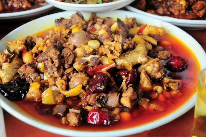 辣子雞的用料以剛打鳴的公雞為最好,一定要是短腳桿自然啄食的土雞,這邊顧客剛挑好雞,稱(chēng)罷斤兩,那邊小工已三下五除二把雞拾掇干凈,斬民小塊。主廚的師傅對(duì)配方是保密的,只知要用上好的菜油、豬油、辣椒面和大蒜,并且辣椒的量頗為可觀。從落座到一盤(pán)紅中泛白、辣味十足的雞上桌,前后不過(guò)一二十分鐘,速度快得和辣味一樣驚人。這辣子雞的辣不似尋常辣味,是辣中有香,辣而不過(guò),讓人吃一口還想吃第二口,直到滿(mǎn)頭大汗,欲罷不能。如果顧客對(duì)“辣”實(shí)在敏感,不要緊,可以要求一半的雞做辣子雞,另一半拿來(lái)黃燜,一樣噴香撲鼻,卻溫和平淡了許多。光吃雞不行,配套的小菜也都是預(yù)備好的:炸洋芋條、炸臭豆腐、淡煮苦菜湯、豆花、小饅頭,一色清淡,正與火爆的辣子雞互補(bǔ),由不得食客不滿(mǎn)意。吃剩下的雞肉店家會(huì)囑咐你打包帶走,拿回家去下面條,足可余香三日。