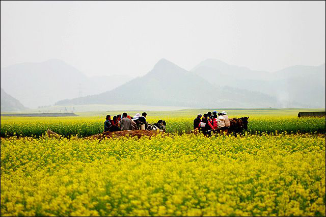 一棵油菜花孤單不起眼,一塊油菜花地難免單薄式微,可是若是成千上萬塊油菜花地連在一起,你能想象出無邊的黃色花海再陽光里閃閃爍爍、隨風(fēng)起伏的模樣來嗎。今年有幸見到一次,沉浸在馥郁菜花香中的時(shí)候,忽然想起來,小時(shí)候看過的動(dòng)畫片《小蜜蜂》,里面那些頑皮可愛的昆蟲飛過植物的時(shí)候,每一朵花,每一片葉子都那么龐大,人類當(dāng)然不會(huì)有這種體驗(yàn),不過,站在浩瀚的花海邊,我也成了一只小蜜蜂,不敢太接近,怕被夢幻一般的美景吞噬。
