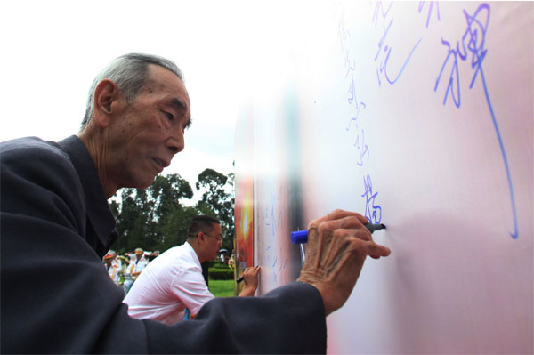 金寶山特別邀請春城晚報副總編輯、我省著名詩人嘉費擔(dān)任《英雄墻上的紅色人生》編委會主任。在書籍啟動儀式上發(fā)表了熱情洋溢的講話,他說:“今天,來到金寶山軍魂園參加《英雄墻上的紅色人生》書籍啟動儀式,我倍感榮幸?吹浇饘毶杰娀陥@這樣一個龐大的精神寶庫,能夠近距離感受到革命先輩留下來的紅色文化,似乎歷史就歷歷在目;再者,看到了來參加活動的革命老前輩,他們風(fēng)采仍舊、身體健朗,向人們講述著那個激情燃燒的紅色歲月,這種感動就在眼前,也深植于我們的心間。我們要穿過歷史,回到那個戰(zhàn)火硝煙的年代,解讀英雄們那些偉岸的背影,參與到每一個人、每一件事的歷史回眸,為每一個革命先輩的紅色人生寫下光彩的一筆,在書寫中傾注著我們的崇敬,并圓滿地完成《英雄墻上的紅色人生》這本書籍的編輯工作。”關(guān)于此書的意義,費嘉表示,書籍的意義就意味著永恒,通過文字的傳承,那些歷史的記憶是經(jīng)久不衰的。我們把這種值得珍藏和傳承的回憶寫進書里,讓書籍成為傳遞英雄紅色文化的載體,為時代留下英雄的足跡和人生解讀,這無疑是一件十分有意義的事情,而且也是精神文明建設(shè)的組成部分。之后,他在背景墻上留下了“英雄不朽、偉業(yè)長存。”的感言。