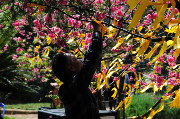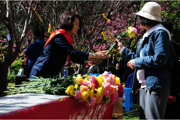 清明是一年之中萬物勃發(fā)、最具生機(jī)的節(jié)日。在這個日子里,既充滿了懷念故人的情懷,也洋溢著人們外出踏青、享受萬物復(fù)蘇的熱情。此時正值人間四月天,花事正濃,百花齊放,春色滿園。在那櫻花盛開的地方,“雅韻追思”優(yōu)雅的曲調(diào),正伴著陣陣花香和縷縷清風(fēng),緩緩的飄蕩到人們的耳中。黃絲帶系在正在盛開的櫻花枝頭上,人們聆聽的不僅僅是那個崢嶸歲月的故事,也追憶著當(dāng)年那份難忘的情誼。這將傳統(tǒng)節(jié)日與當(dāng)下生活的多姿多彩完美融合,是金寶山堅(jiān)持13年的清明文化理念之一。