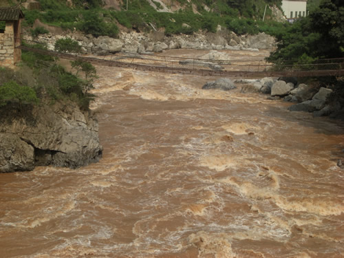 “鐵索橋”,又名 “普渡河橋”,位于祿勸縣翠華鄉(xiāng)頭哨與沿河辦事處之間的普渡河上。兩岸懸崖筆立,河水奔騰咆哮,地勢十分險要。該橋始建于1928年初。橋身由8根鐵索并列,再鋪上木板構(gòu)成,長36米,寬2米,西端又再接長10米的木結(jié)構(gòu)引橋,全長46米,是由尋甸通往金沙江邊的重要通道。