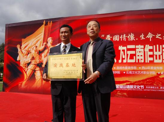 任建軍:金寶山建園九年來,堅持突出先烈先輩們的人文價值,搭建各種不同的活動平臺,形成了獨有的紀(jì)念文化體系,收到了較好的社會效益。黨和政府相關(guān)部門,對我們的工作給予了大力幫助和支持,并充分肯定了取得的成績。去年,中共昆明市委、昆明市人民政府授予金寶山“昆明市愛國主義教育基地”稱號,今天,云南省教育廳又授予金寶山“三生教育實踐基地”稱號。這對我們的工作是極大的支持和鼓勵,同時又是動力。金寶山將更好地發(fā)揮愛國主義教育和三生教育功能,為構(gòu)建社會主義和諧社會貢獻(xiàn)自己的力量。