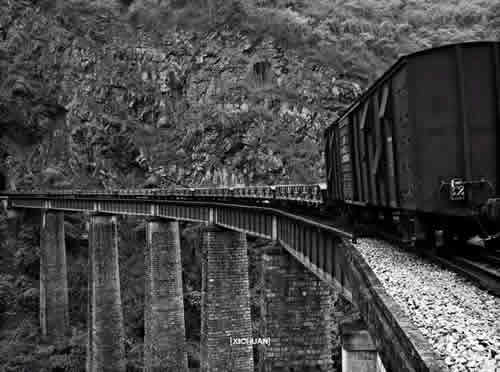插圖23:一百年來(lái),千百萬(wàn)輛火車(chē)駛過(guò)人字橋,這座橋是整條滇越鐵路的咽喉,為修此橋,800多名勞工葬身于橋下百米深的四岔河谷。