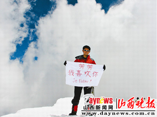 為購買東西方便,老張頭上網(wǎng)尋找翻譯,在網(wǎng)上,他邂逅了芳芳――河北秦皇島某大學法語系學生。以后,從相識到相戀,兩人感情不斷升溫。“我在這個地方住幾天,又得趕往別的地方參加活動,這么多年,芳芳始終沒有明確答應(yīng)做我的愛人。所以,我決定,將我對她愛的誓言帶在身邊,送到我登過的每一個雪山之巔,直至她明確答應(yīng)。”老張頭說。