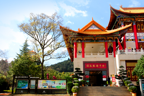 文化廣場以迎賓路為軸線展開,花壇排列,綠草如茵,鮮花四季盛開。氣勢恢宏的門坊上,中國書法家協(xié)會會長劉藝先生題寫的“金寶山藝術(shù)園林”貼金大字熠熠生輝。以門坊為前導,鮮花副食店、佛事用品店、素食軒、園滿中心等明清風格建筑群錯落有致,營造出博大、典雅的氛圍。