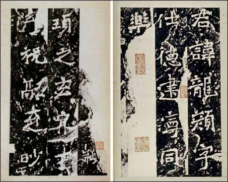 《爨龍顏碑》立于南朝宋大明二年(四五八),比《爨寶子碑》晚五十三年?梢哉f這兩塊碑是同時代的作品。它的結(jié)體以方整為主,但轉(zhuǎn)折處已使用圓轉(zhuǎn)筆法,而不像《爨寶子碑》那樣如矩形的折角,更具有楷書的特征。我們可以從《爨龍顏碑》筆畫的圓潤剛強,窺見其運筆實源于篆法,起筆雖有方圓之分,但筆劃均極為厚重。《爨龍顏碑》在手法上俯仰揖讓,疏密相間,在結(jié)構(gòu)上姿態(tài)奇逸,舒斂自如?涤袨樵u說:“下畫如昆刀刻玉,但見渾美;布勢如精工畫人,各有意度,當(dāng)為隸楷極則。”
