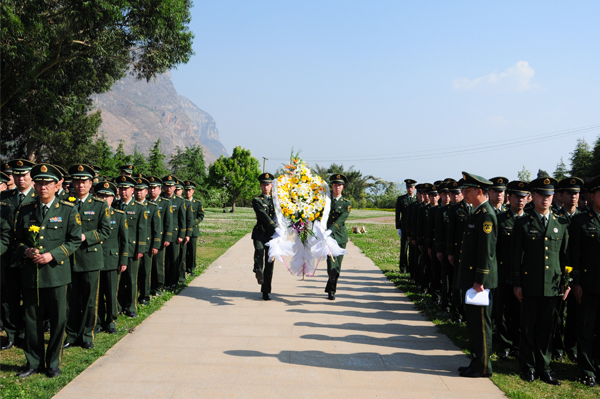 每年四月,除了社會(huì)團(tuán)體,武警邊防總隊(duì)的各個(gè)部門也會(huì)組織到忠誠(chéng)衛(wèi)士英烈廣場(chǎng)看望維和英雄,看望為邊防事業(yè)付出血的犧牲的戰(zhàn)士。青年志愿者團(tuán)隊(duì)的同學(xué)剛走,忠誠(chéng)衛(wèi)士英烈廣場(chǎng)又迎來(lái)了一批祭掃人群,他們是邊防總隊(duì)士官學(xué)校的160多名邊防戰(zhàn)士,他們踏著整齊的步伐,敬獻(xiàn)花圈,整理著裝,集體默哀,依序獻(xiàn)花,每一個(gè)步驟都透露著軍人嚴(yán)謹(jǐn)?shù)娘L(fēng)格和鐵一樣的紀(jì)律,在國(guó)旗前,他們對(duì)著英烈說出自己的誓言,終生不悔。