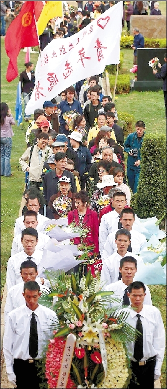 上午11時許,在金寶山軍魂園里,前來拜祭的軍人親屬不斷增多,或靜靜立在墓前,或撫摸碑身低低細語;蛟S是感知到親人們的思念情懷,滿山翠綠的樹葉發(fā)出沙沙的聲音。“軍魂園”獻花儀式開始了,走在最前面的是身著白色襯衫的十人獻花禮儀隊,他們端著鮮花花圈邁著標準的步伐,