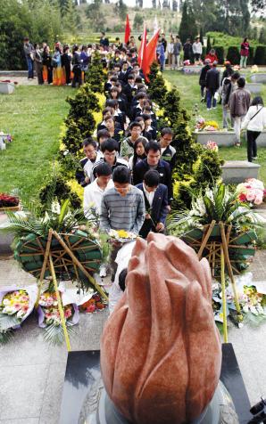 給軍魂園火炬送上鮮花 記者龍宇丹/攝 當(dāng)同學(xué)們把一朵朵寄托追思的白菊花、黃菊花在先輩們的墓前獻(xiàn)上時,他們的表情莊嚴(yán)而凝重,這一刻這群年輕人的心里充滿了對先輩的敬重和對生命的思考。