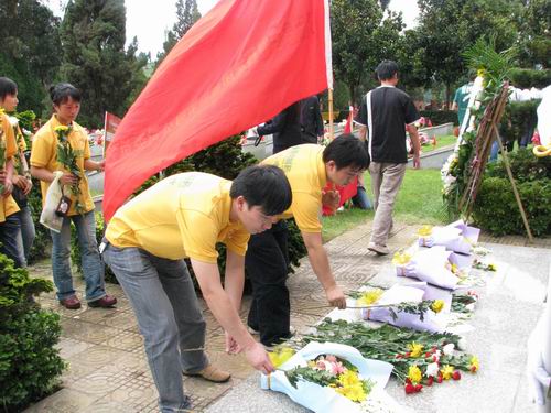 領(lǐng)隊(duì)龔全告訴記者:“之所以5年來一直參加此項(xiàng)活動(dòng),是想通過愛國主義教育,讓我們的年輕員工不要忘記老一輩革命家的拼搏精神,不要忘記今天的幸福生活是用血與汗換來的,要倍加珍惜今天的生活,更要用勤奮努力創(chuàng)造美好的明天。”他說,在國慶60周年即將到來之際,為了在今天的軍魂園紀(jì)念活動(dòng)中體現(xiàn)團(tuán)員青年的時(shí)代風(fēng)貌,專門排練了多聲部的四人小合唱“游擊隊(duì)之歌”,通過歌聲來表達(dá)對革命先輩的敬仰。
