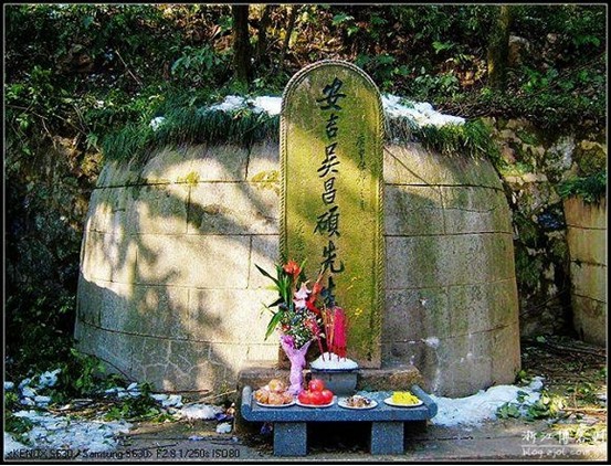 民國16年十一月(1927年11月6日),吳昌碩突患中風,十一月初六(1927年11月29日)病逝滬寓,享年84。先生生平酷愛梅花,常到超山探梅。1927年病故上海,遵其遺愿身后埋骨超山香雪塢,1932年移柩安葬超山大明堂西側(cè)。墓東立有章炳麟篆額、馮君木撰文、于右任書丹的吳昌碩先生墓表,墓左側(cè)為建于1986年的吳昌碩先生紀念館,墓門石柱上刻有沈淇泉(衛(wèi))所撰聯(lián)語:"其人為金石家,沉酣到三代鼎彝,兩京碑碣。此地傍玉潛故宅,環(huán)抱有幾重山色,十里梅花。吳昌碩墓1966年被破壞,1980年重建。墓朝東北向,高2米,直徑3米,墓碑由諸樂三題“安吉吳昌碩先生墓”。大明堂浮香閣藏有陳三立撰文、朱孝藏書丹、鄭孝胥書蓋的《安吉吳先生墓志銘》。1989年為浙江省重點保護文物。